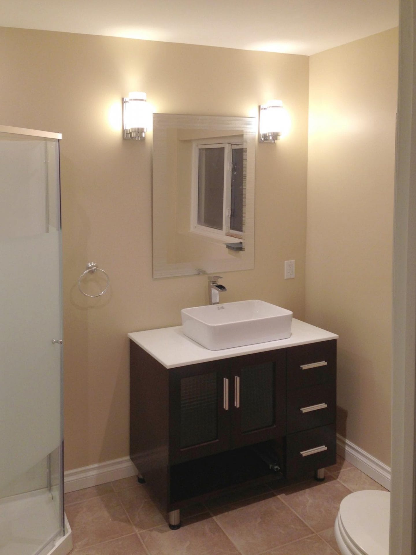 Brand new basement bathroom build, new plumbing, recessed lighting, wall mounted vanity, new glass shower enclosure, adjustable shower handle control arm, dual flush toilet, ceramic white penny tile, porcelain Carrera Marble wall tile, and hardware