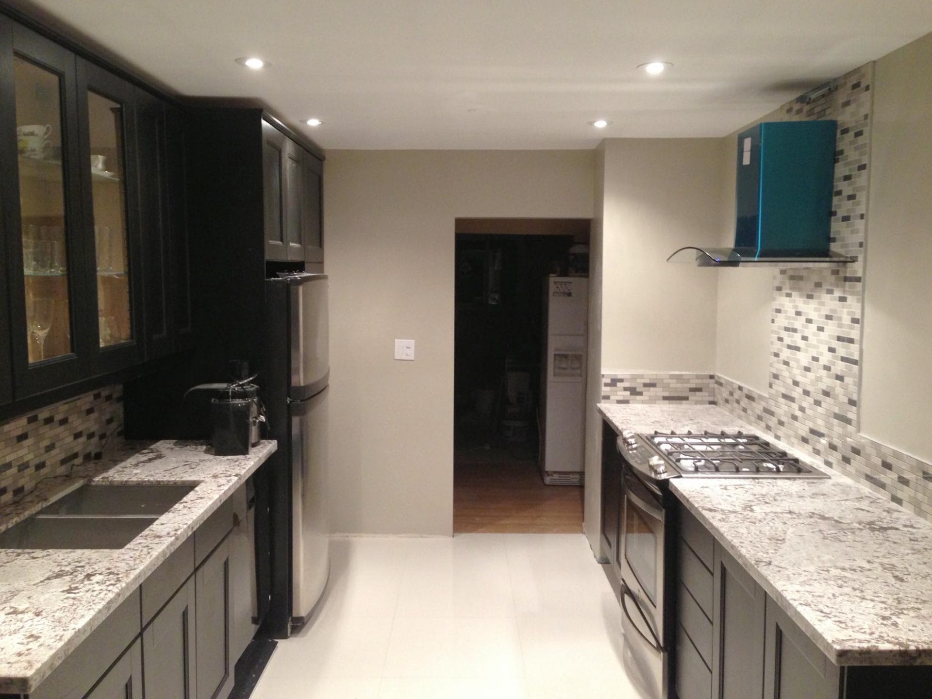 Warm modern shaker galley kitchen new recessed lighting, 24 inch porcelain sandstone tile, black/brown shaker style cabinets with clear glass inserts, granite countertop with slide in oven, square double under-mount ss sink, ceramic mosaic backsplash and range hood. Kitchen