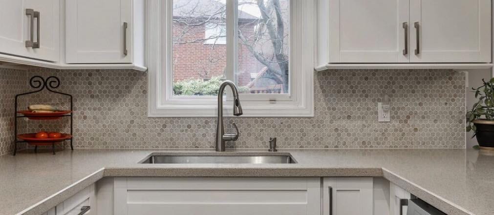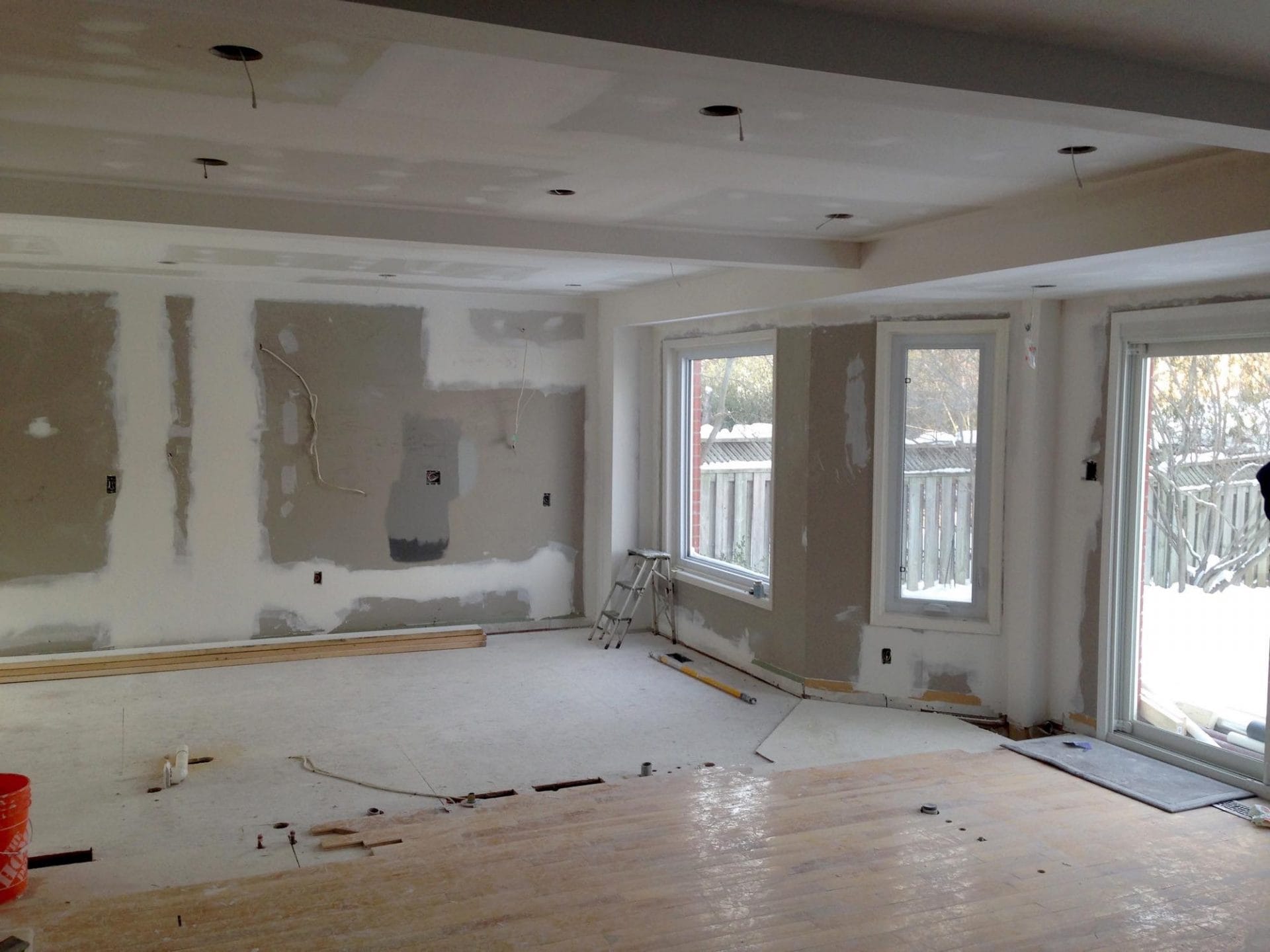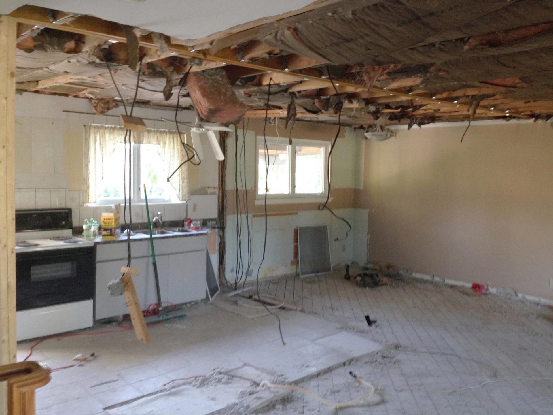 wall removal, new ceiling install with recessed lighting, new shaker style kitchen cabinets, quartz counter top, pendant lighting, maple flooring, dual step baseboards with matching shoe moulding,