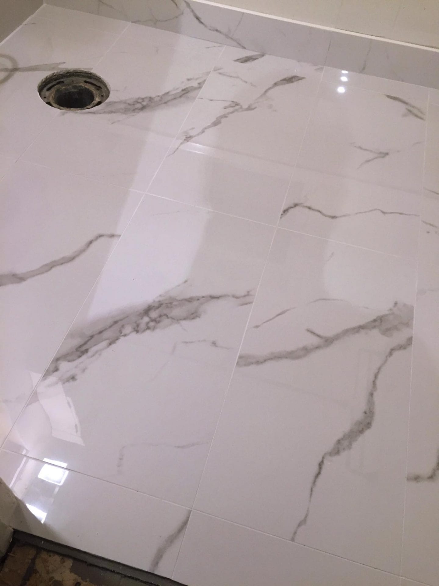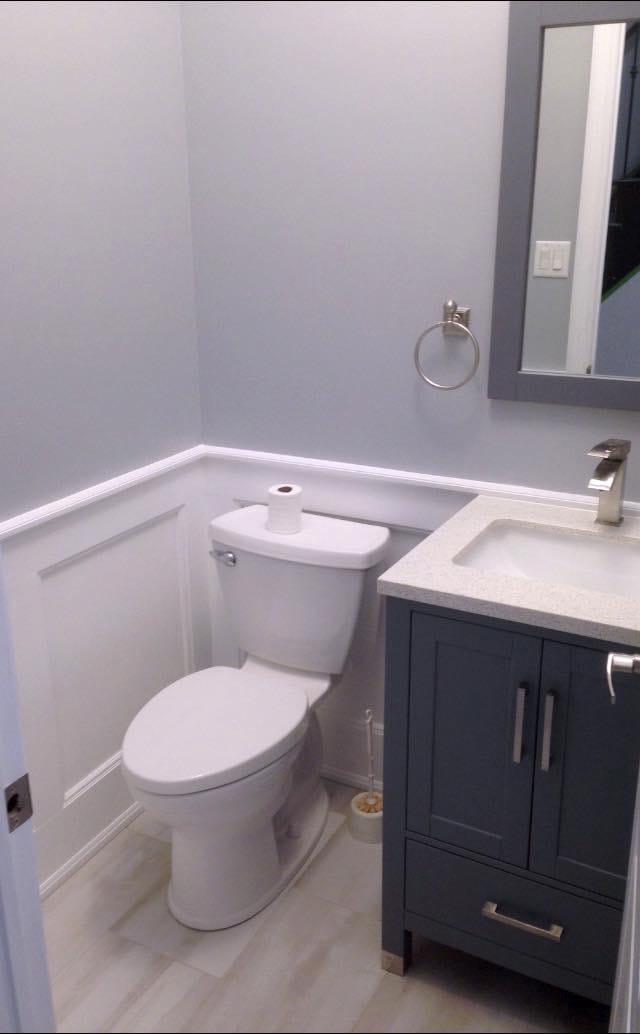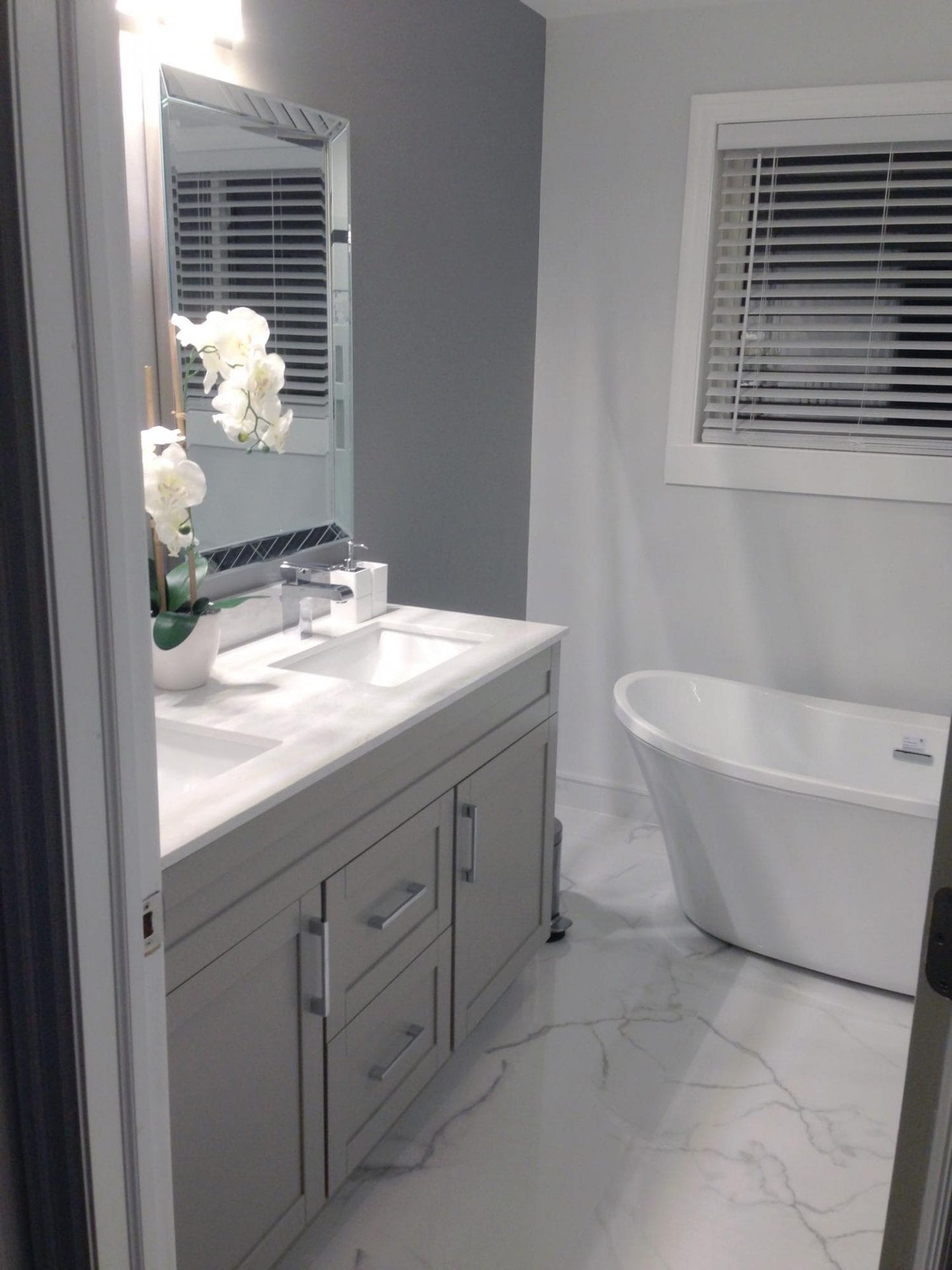 Full bedroom to master bath conversion , new drainage/venting and water supply lines, 24″ x 24″ porcelain Carrera marble tile, Bright white flat white porcelain wall tile with pebble stone accent strip, new dual flush toilet, solid wood 60″ double vanity with quarz countertop and single arm faucets, 60″ soaker tub and hardware