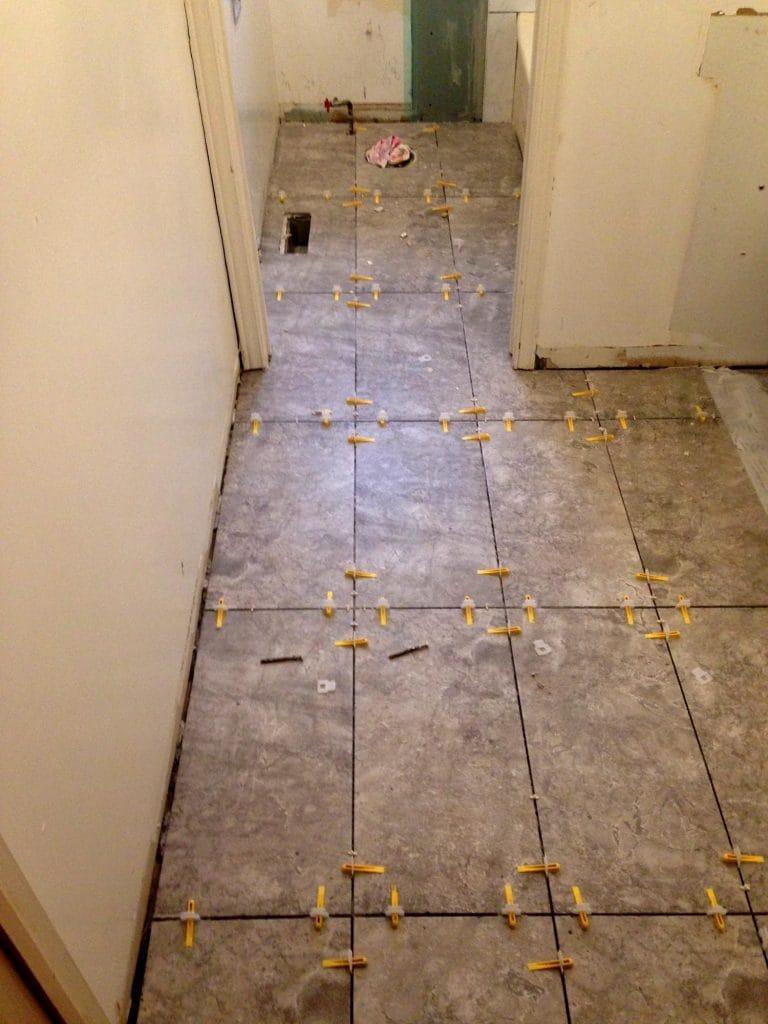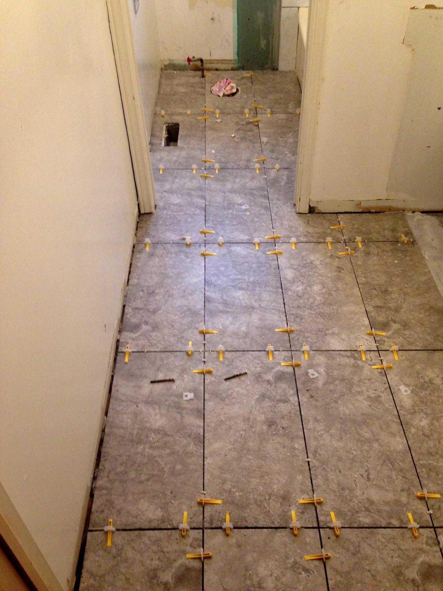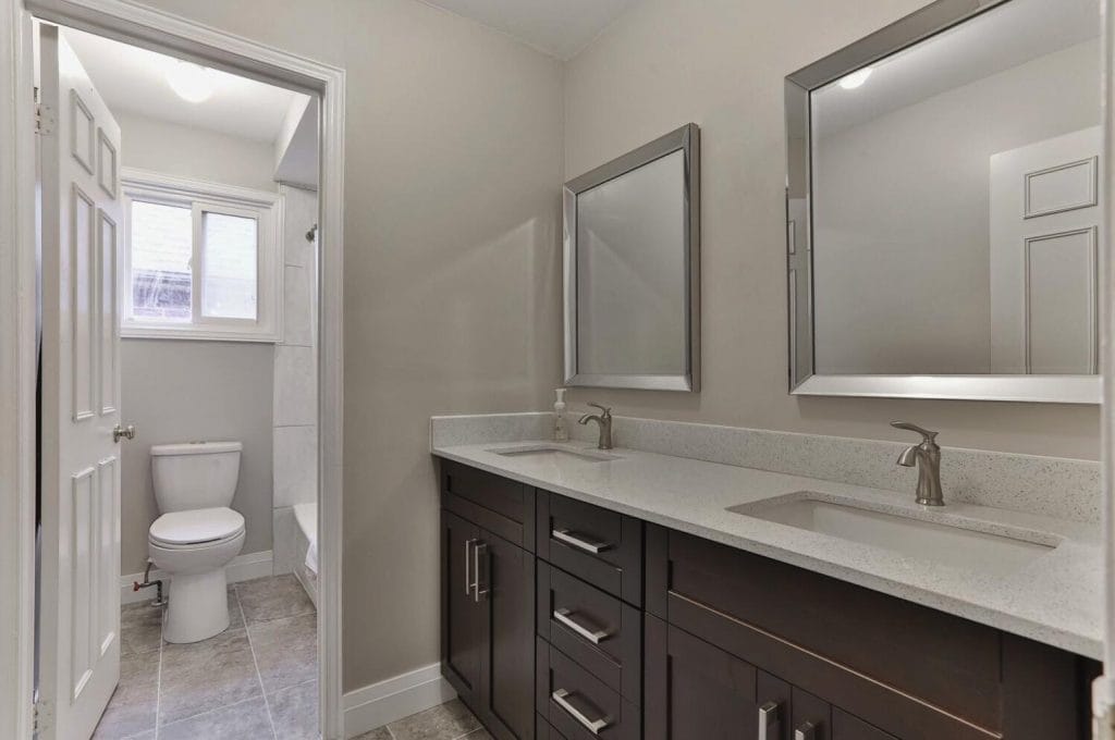 Reglazed bathtub, neutral wall/floor tile, subtle beige walls with contemporary solid wood double vanity with quartz countertop and single handle faucets