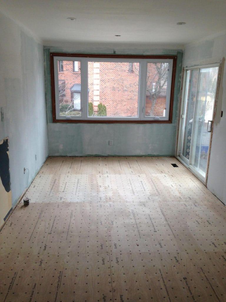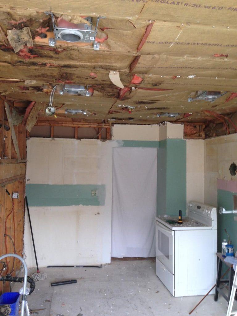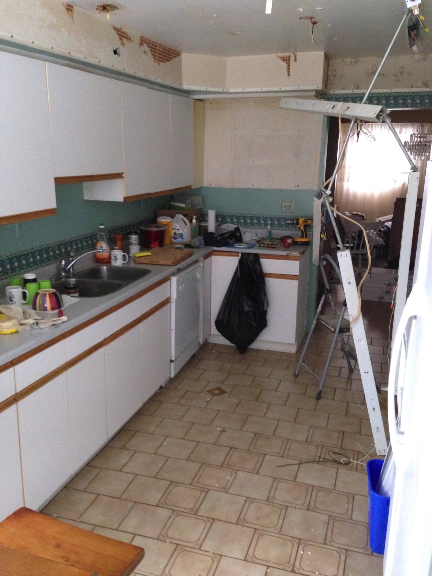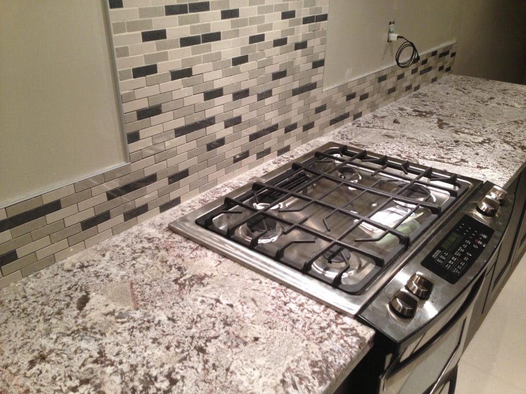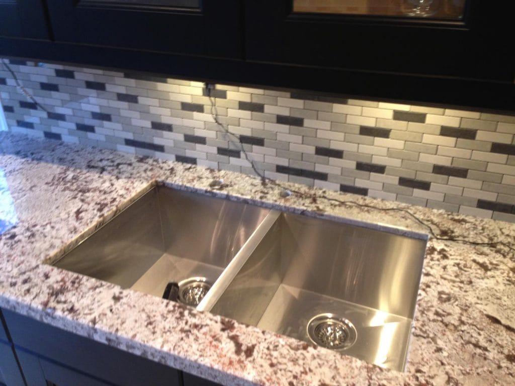 new recessed lighting, 24 inch porcelain sandstone tile, black/brown shaker style cabinets with clear glass inserts, granite countertop with slide in oven, square double under-mount ss sink, ceramic mosaic backsplash and range hood.