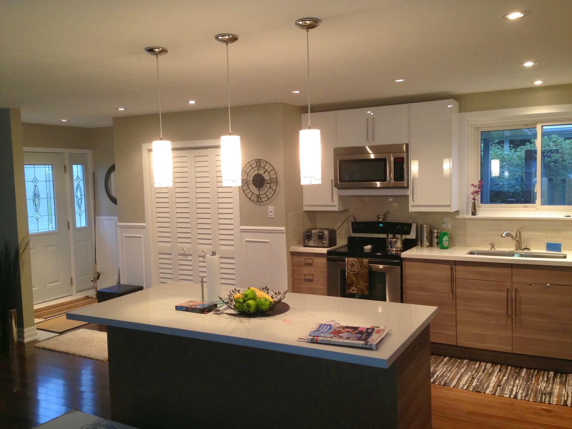Main floor kitchen/ living room/ dining room open concept kitchen (island and pendant lights)