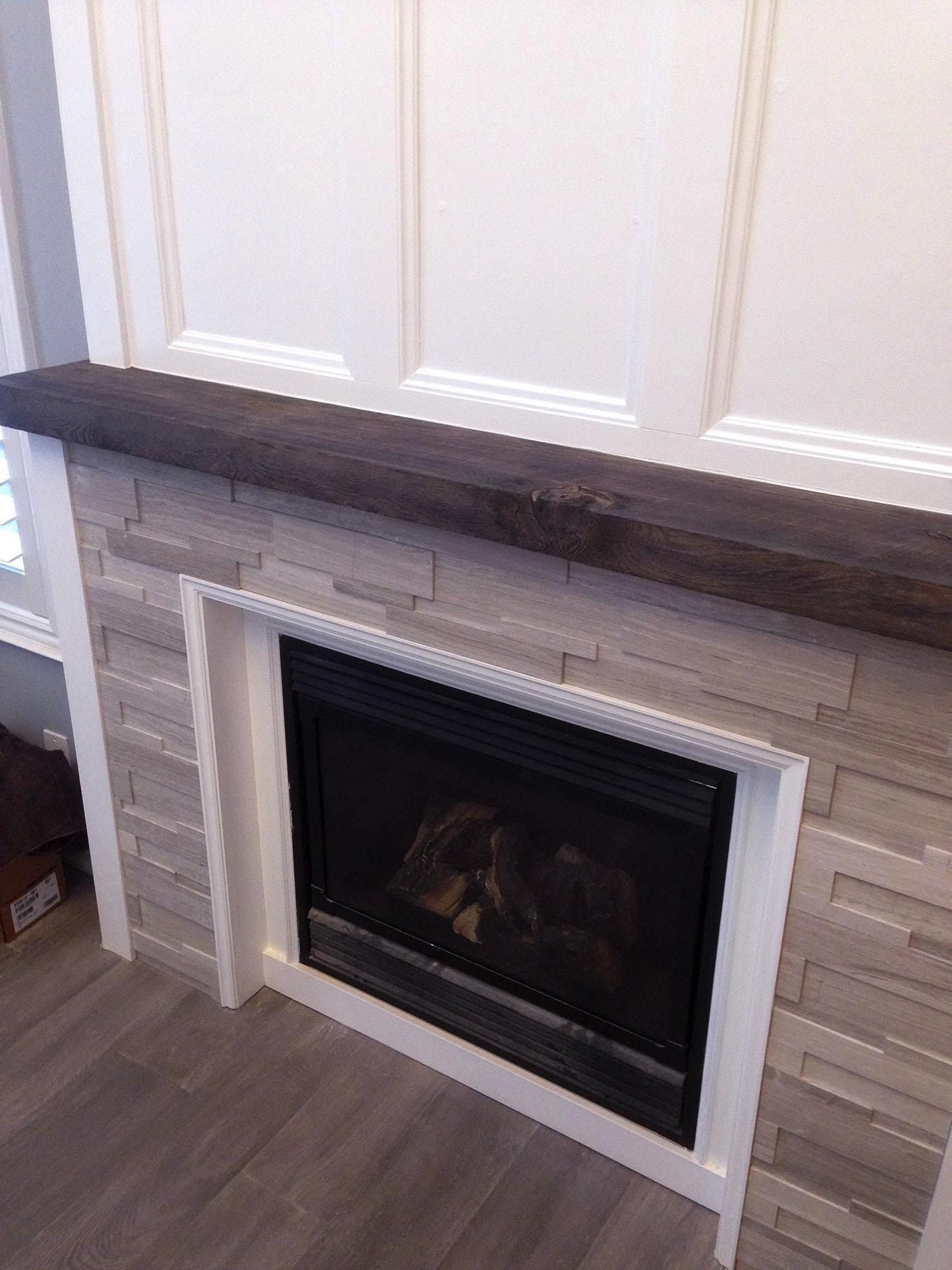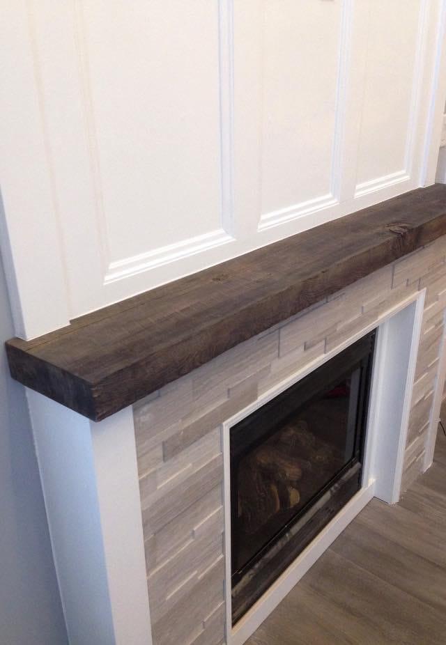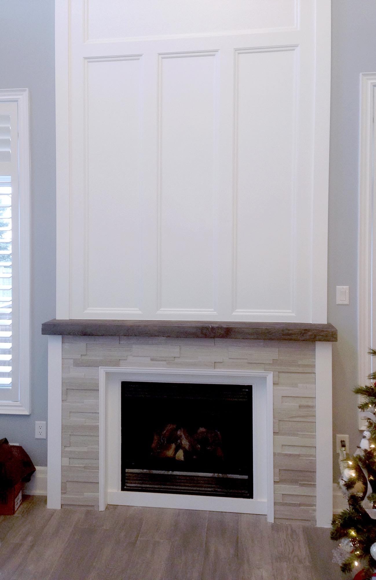 Fireplace build/tile with custom barn-board stain and trim