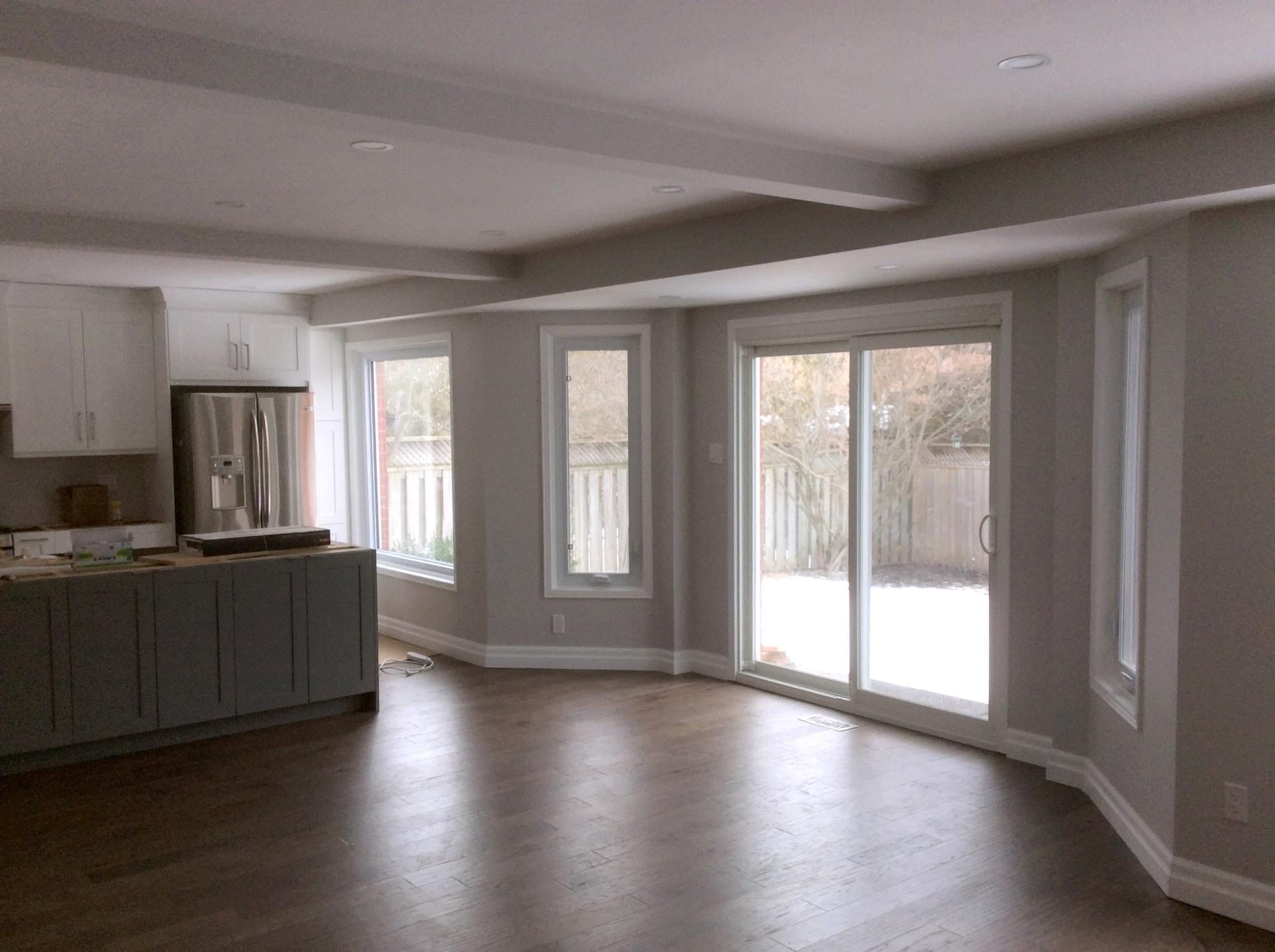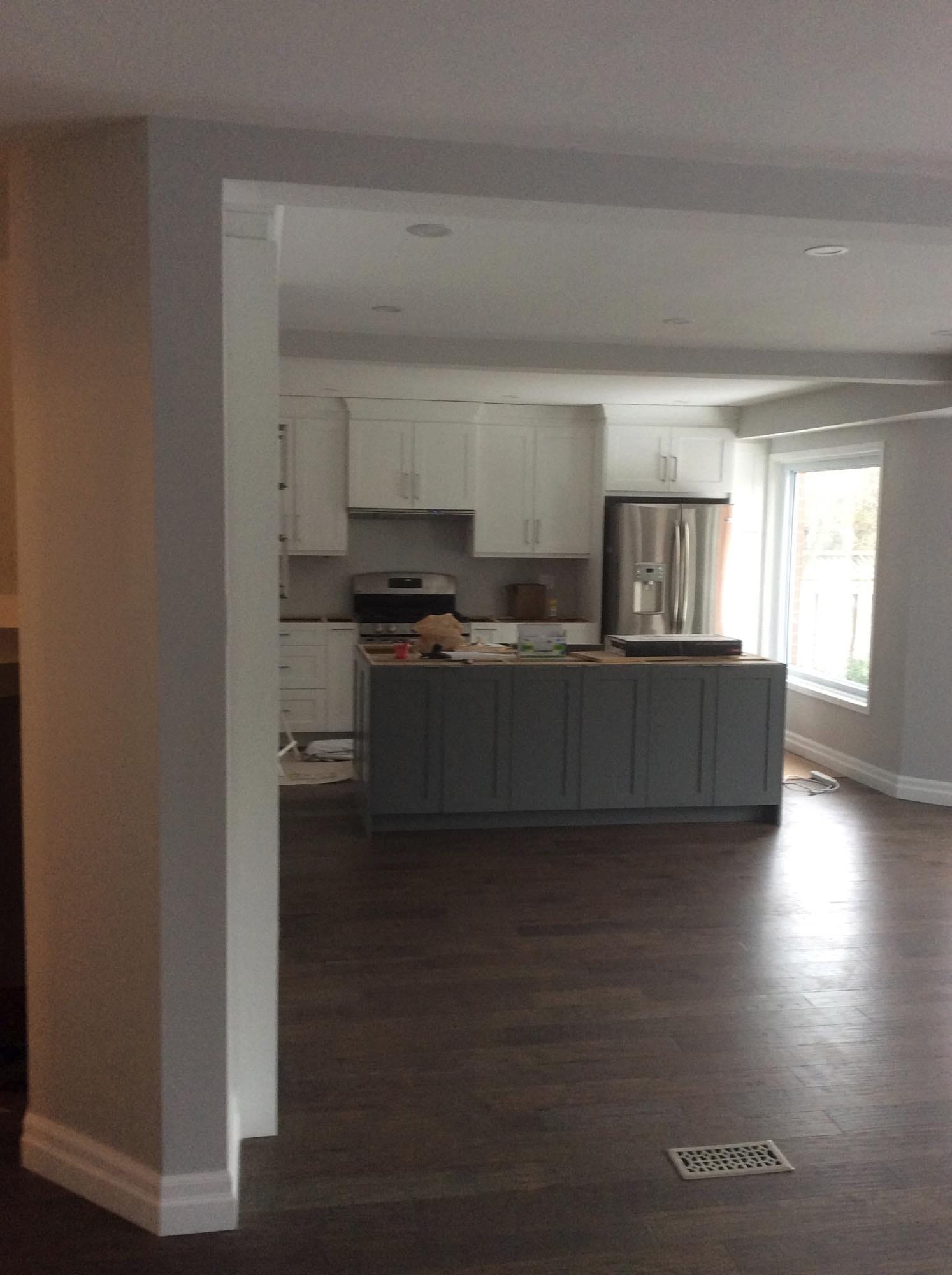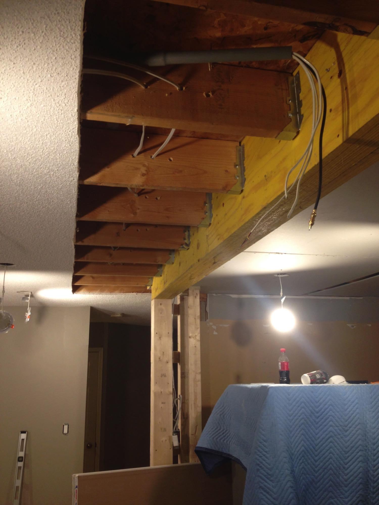Items included; LVL beam install, bulkhead build, drywall/taping, pot light install, flooring installation, painting and trim